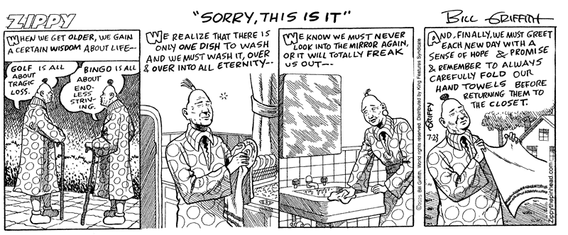 To order a Signed Print or Original Art of any Zippy strip, just write us at griffy@zippythepinhead.com and request a Paypal purchase link. Personal checks also remain an option (send check only after making your email request: Pinhead Productions, PO Box 88, Hadlyme CT 06439).