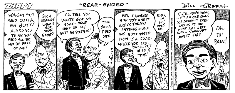 To order a Signed Print or Original Art of any Zippy strip, just write us at griffy@zippythepinhead.com and request a Paypal purchase link. Personal checks also remain an option (send check only after making your email request: Pinhead Productions, PO Box 88, Hadlyme CT 06439).