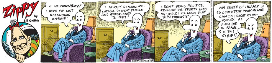 To order a Signed Print or Original Art of any Zippy strip, just write us at griffy@zippythepinhead.com and request a Paypal purchase link. Personal checks also remain an option (send check only after making your email request: Pinhead Productions, PO Box 88, Hadlyme CT 06439).